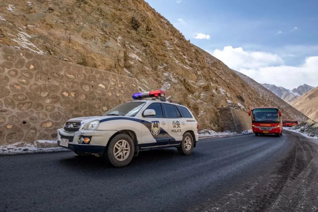 在蜿蜒陡峭的公路上,路旁就是懸崖絕壁,車隊一路謹慎駕駛。“護學隊”采取由一輛警車帶道,另一輛警車收尾的方式護送,遇到急彎鳴笛示意對向來車,以確保整個車隊的安全。127公里的路程,海拔由1300米陡升至3500多米,每到一處結冰路段,“護學隊”都在何海東的指揮下,低檔低速前行。