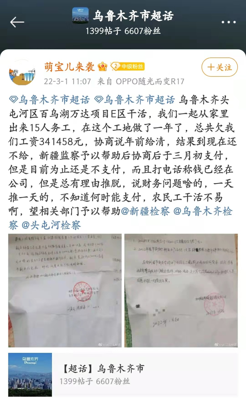 “15個人從老家出來務工,在工地干活一年了,被拖欠工資341458元,希望相關部門予以幫助?!?2022年3月1日,網友“萌寶兒來襲”@“頭屯河檢察”求助稱。