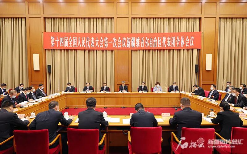 新疆平安網訊 3月5日下午,參加十四屆全國人大一次會議的新疆代表團舉行全體會議,審議政府工作報告。全國人大代表、新疆代表團團長、自治區黨委書記馬興瑞主持會議。