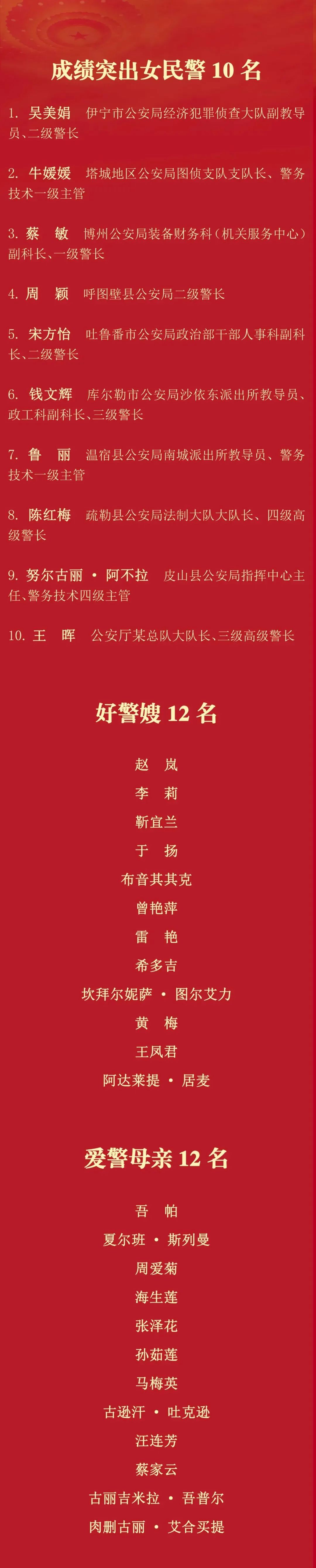 新疆平安網(wǎng)訊 為表揚(yáng)先進(jìn)、樹立榜樣,在“三八”國際勞動?jì)D女節(jié)來臨之際,公安部、全國婦聯(lián)決定,對全國公安機(jī)關(guān)200名成績突出女民警、296名好警嫂、294名愛警母親予以通報表揚(yáng)。其中,新疆10名成績突出女民警、12名好警嫂、12名愛警母親受到通報表揚(yáng)。