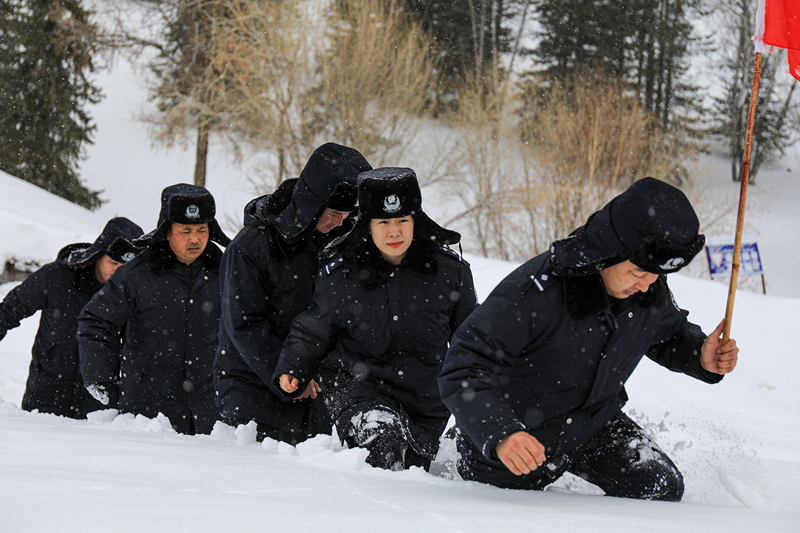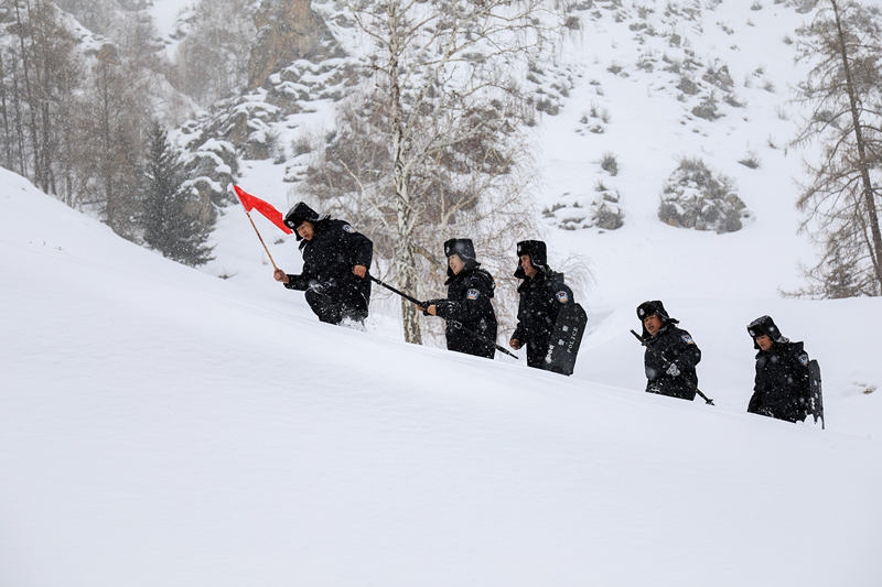 近期,新疆北部降雪,部分山口積雪厚度達60厘米。3月7日,新疆出入境邊防檢查總站阿勒泰邊境管理支隊富蘊大隊庫衛邊境派出所民輔警冒雪對邊境前沿地帶開展巡邏踏查。民輔警翻雪山、越達坂,對重點區域進行徒步巡邏,確保邊境前沿地帶絕對安全穩定。期間,女警不畏艱難勇毅前行,成為邊防線上一道靚麗的風景。(李銘驥)