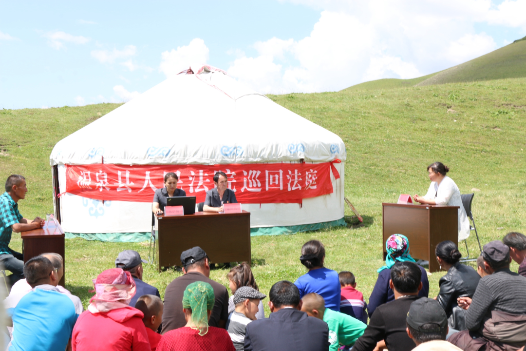 溫泉縣居住著較多牧民,溫泉縣人民法院結合地理環境,積極開展“送法進山、送法近心”普法宣傳活動。通過建立“馬背法庭”,運用巡回審判解決矛盾糾紛的同時,還為牧民講解環境資源典型案例,以點帶面,調動大家保護草原、建設草原的積極性,增強牧民環保法律知識。