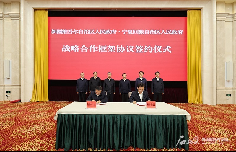 5月10日,新疆維吾爾自治區及新疆生產建設兵團·寧夏回族自治區工作協作座談會在銀川召開。寧夏回族自治區黨委副書記、自治區主席張雨浦,新疆維吾爾自治區黨委副書記、自治區主席艾爾肯·吐尼亞孜代表兩區簽署《新疆維吾爾自治區人民政府 寧夏回族自治區人民政府戰略合作框架協議》。天山網-新疆日報記者 崔志堅 攝