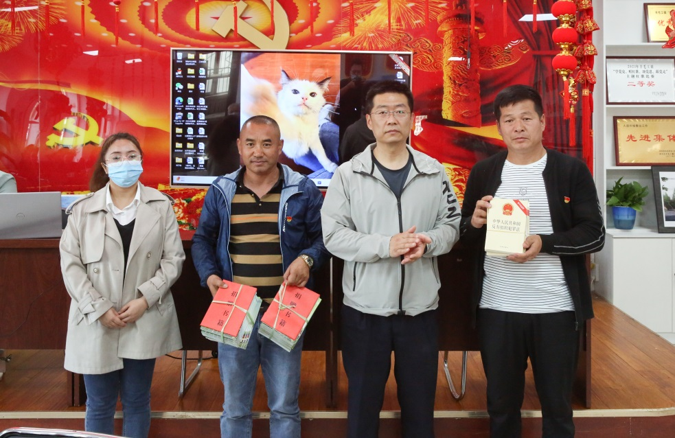 普法活動后,黨員干部們來到紅雁湖村稻田中。幾位農民忙著搬運培育好的秧盤,放置在插秧機上,伴隨著一陣陣轟隆隆的機器聲,插秧機來回穿梭,一株株嫩綠的秧苗從插秧機苗盤上滑落,水田很快披上了綠裝。村里的種糧大戶李清介紹說,自機械化作業替代過去“手把青秧插滿田”的方式以來,從育秧到收割,全程機械化作業,大大減少了人工成本,極大提高了生產效率。
