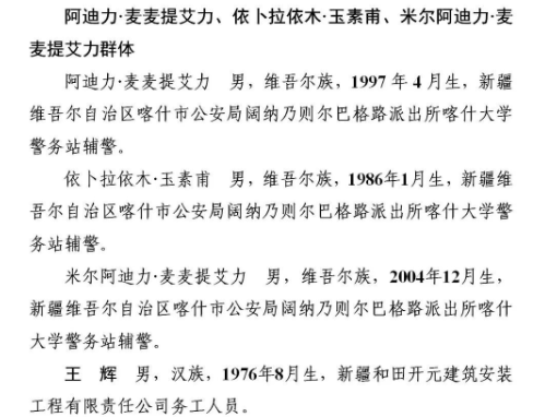 阿迪力·麥麥提艾力,男,維吾爾族,1997年4月生,新疆維吾爾自治區喀什市公安局闊納乃則爾巴格路派出所喀什大學警務站輔警。