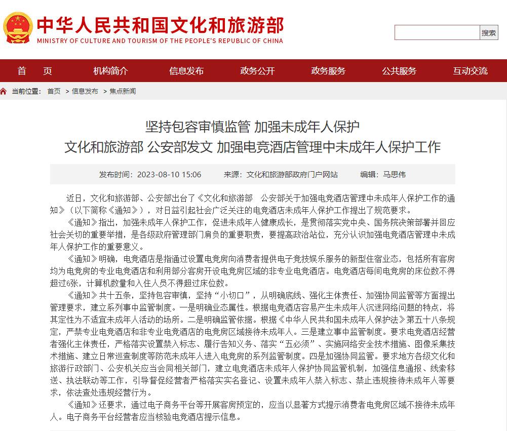 新疆平安網訊 近日,文化和旅游部、公安部出臺了《文化和旅游部 公安部關于加強電競酒店管理中未成年人保護工作的通知》(以下簡稱《通知》),對日益引起社會廣泛關注的電競酒店未成年人保護工作提出了規范要求。