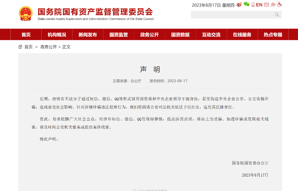 國務院國資委辦公廳8月17日在國務院國資委官網發布聲明稱,近期,持續有不法分子通過短信、微信、QQ等形式冒用國務院國資委和中央企業領導干部身份,甚至偽造中央企業公章、公文實施詐騙,造成惡劣社會影響。針對涉嫌詐騙違法犯罪行為,國務院國資委將商請公安司法機關依法予以打擊,追究其法律責任。