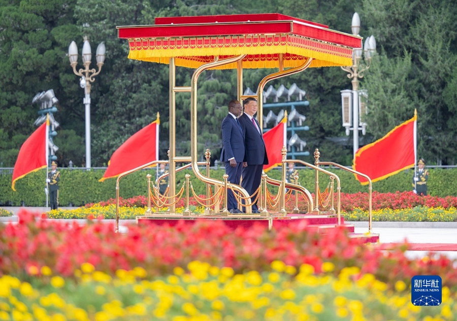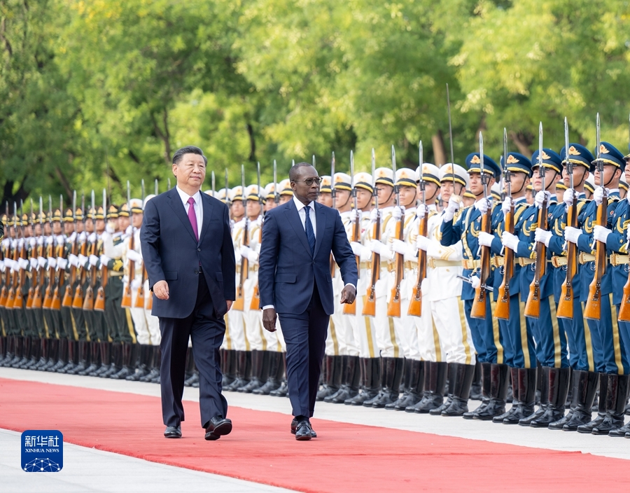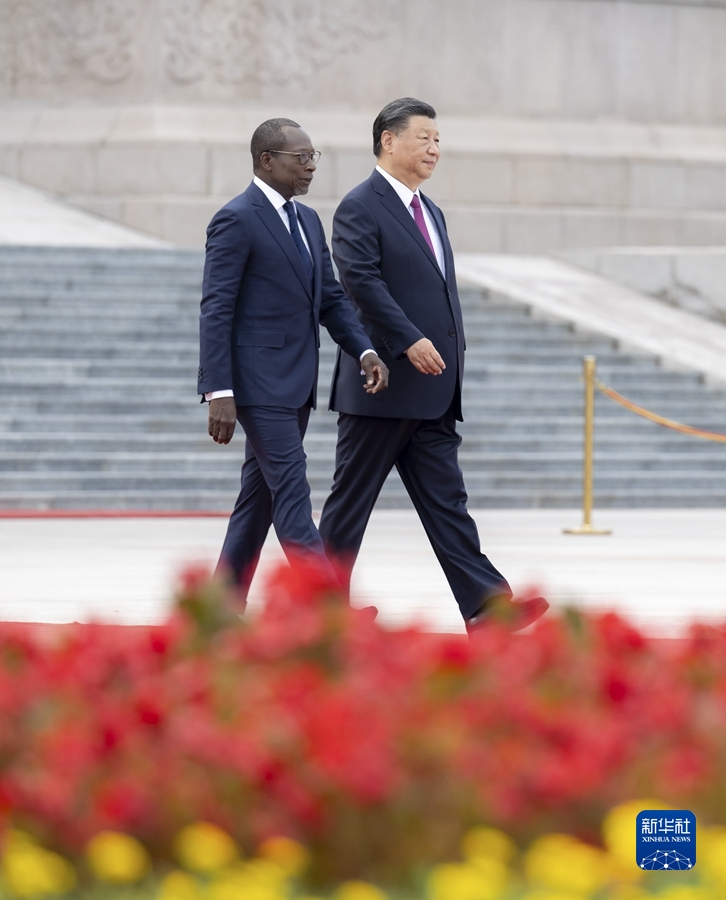 9月1日下午,國家主席習近平在北京人民大會堂同來華進行國事訪問的貝寧總統塔隆舉行會談。這是會談前,習近平在人民大會堂東門外廣場為塔隆舉行歡迎儀式。新華社記者 翟健嵐 攝