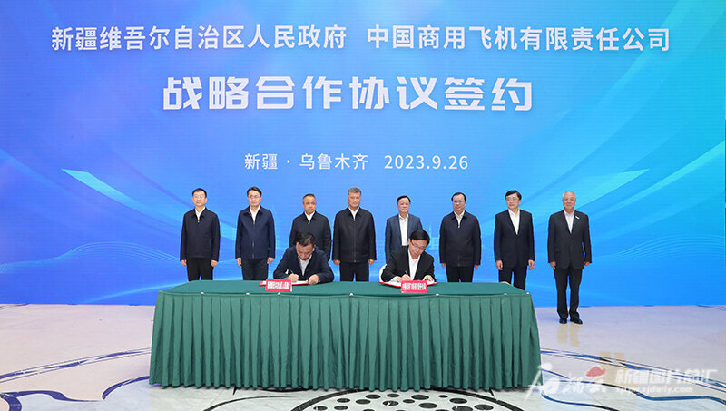 會見后,自治區人民政府與中國商用飛機有限責任公司簽署戰略合作協議,烏魯木齊市人民政府、中國商飛客服公司、新疆機場集團簽署《關于國產商用飛機維修和培訓基地在烏魯木齊市實施建設的合作備忘錄》,成都航空與新疆機場集團簽署《航線合作協議》。