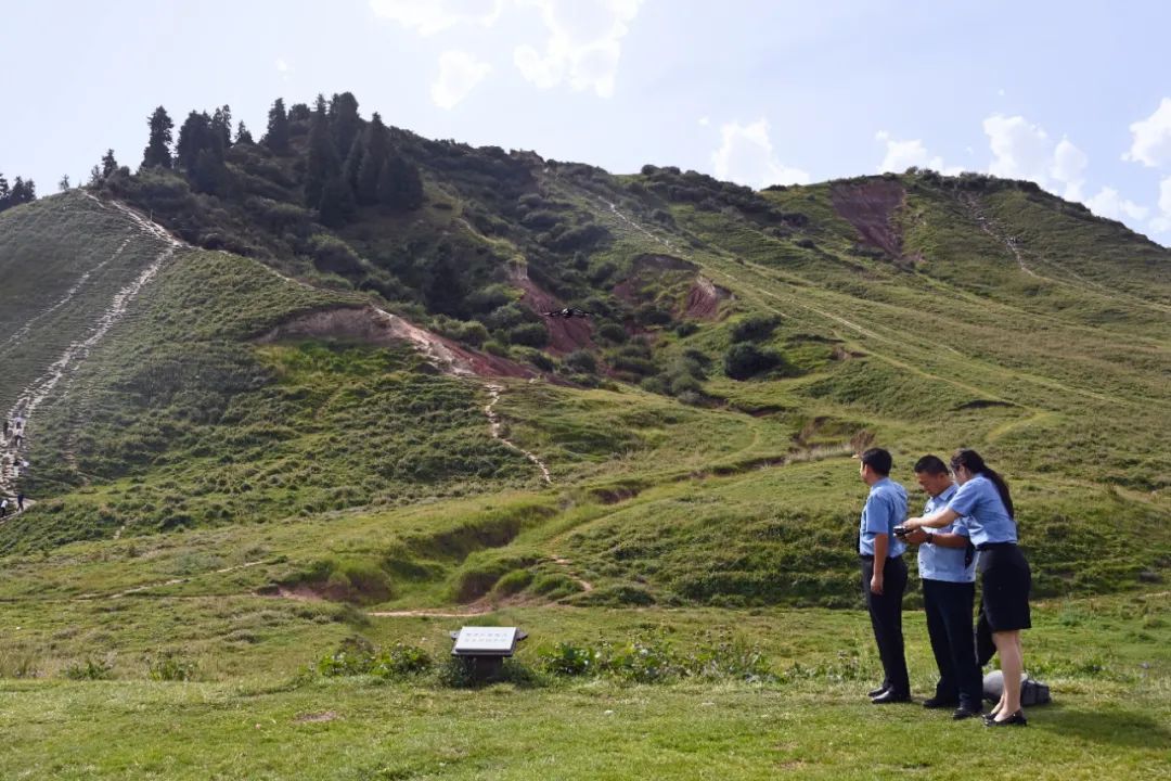 2023年8月11日,新疆維吾爾自治區溫宿縣檢察院檢察官為辦理一起破壞草場生態民事公益訴訟案,利用無人機勘查情況,并為修復工作采集相關數據。鐘心宇 攝