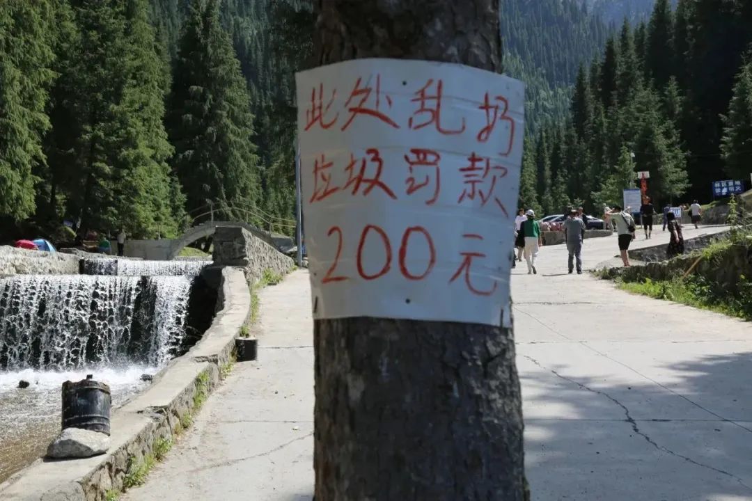 在景區內,檢察官發現山腳下和登山扶梯旁有很多樹木被裹上鐵皮,鐵皮上用紅色油漆歪歪扭扭寫著“此處亂扔垃圾罰款200元”“河內禁止亂扔木頭、石子,違者罰款200元”等字樣,每塊鐵皮都用6-9枚鐵釘固定在樹干上。