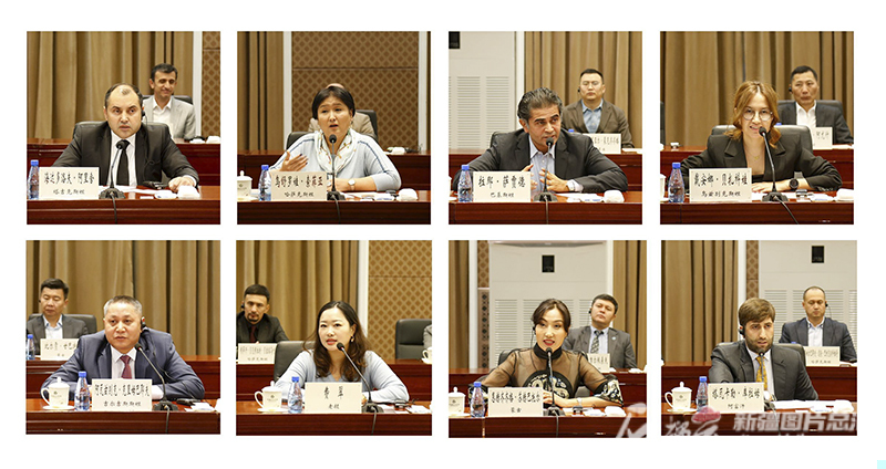 海達(dá)多洛夫·阿里舍、烏舒羅娃·索菲亞、拉那·薩賈德、戴安娜·貝扎科娃、阿瓦茲別克·克里姆巴耶夫、費(fèi)翠、恩赫齊齊格·蘇赫巴托爾、塔瓦卡勒·庫(kù)拉姆發(fā)言(從左至右,從上至下)。石榴云/新疆日?qǐng)?bào)記者 謝龍攝