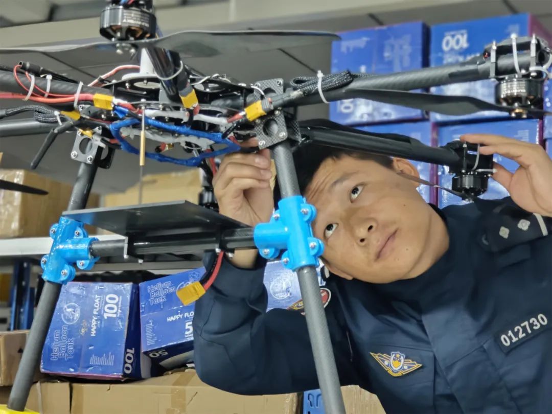 “第一次接觸無人機的時候,只覺得遙控器上有好多按鍵,很難控制。”張旭東回憶。那是2020年1月,張旭東剛加入特警隊不久。