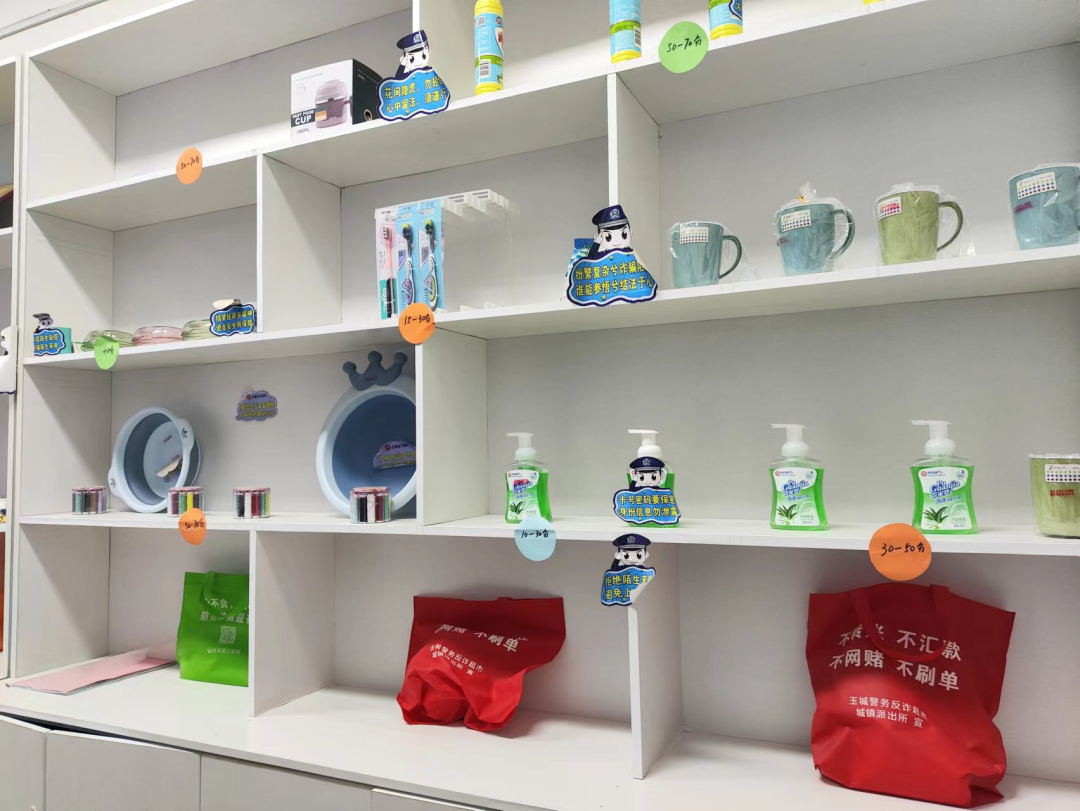 位于且末縣加哈巴格社區內的“石榴籽玉城反詐超市”,是且末縣公安局城鎮派出所聯合社區打造的沉浸式反詐宣傳陣地。11月29日,記者探訪了這個反詐主題超市,看到墻面上掛滿了印有常出現的電信詐騙類型的展板,一旁的貨架上放滿了牙膏、洗手液、臉盆、水杯等生活用品,一應俱全,每一類用品都標注著相應的分值。