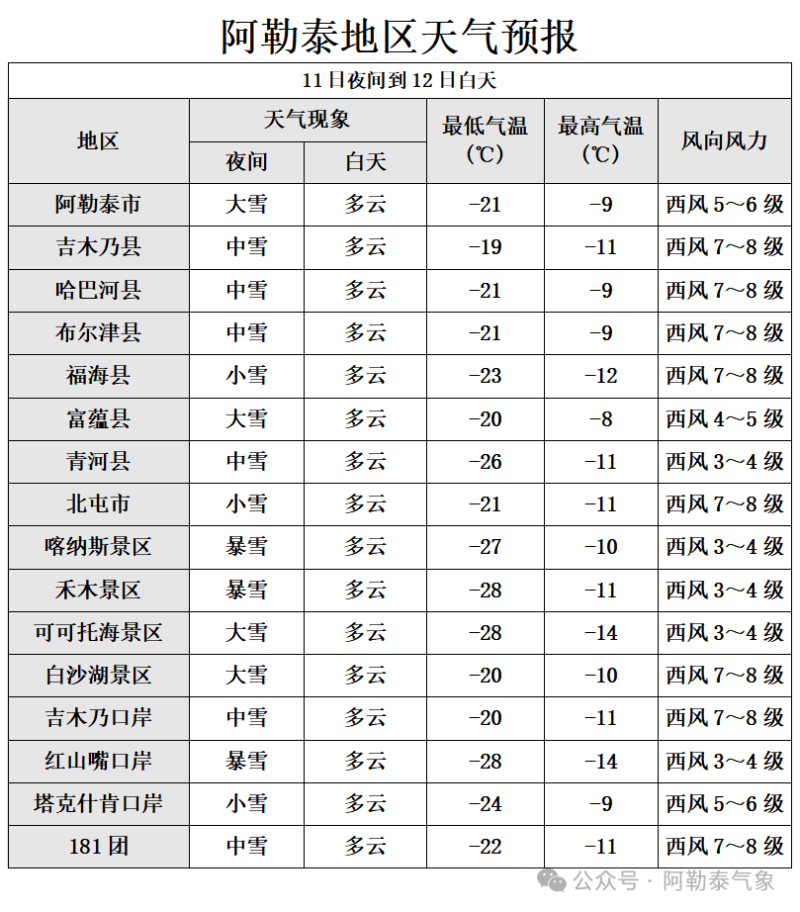 降雪天氣還將帶來明顯降溫。阿勒泰地區氣象臺最新寒潮黃色預警信號顯示,預計2月11~13日,阿勒泰地區大部最低氣溫將下降12℃以上;13日早晨,全區河谷、平原最低氣溫將降至-19℃~-23℃,沿山一帶降至-23℃~-26℃,山區降至-27℃~-34℃,富蘊縣吐爾洪鄉降至-37℃左右。