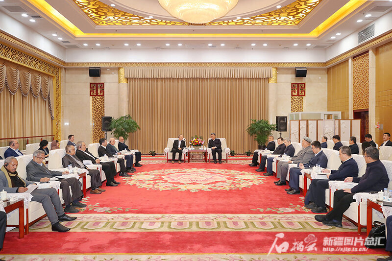 4月8日,自治區黨委書記馬興瑞、自治區主席艾爾肯·吐尼亞孜在烏魯木齊會見有關國家智庫學者?和媒體人士代表團一行。天山網-新疆日報記者 崔志堅攝