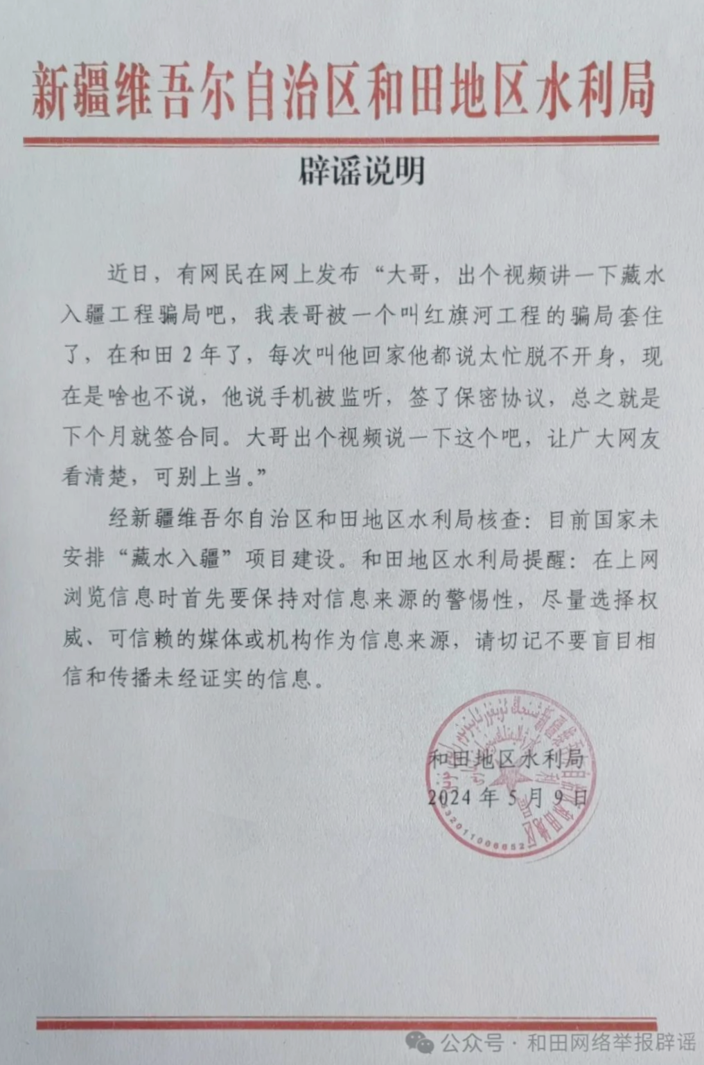 經和田地區水利局核查,目前未接到上級有關部門關于“藏水入疆”工程規劃的通知。其實,早在2015年水利部就曾回應,未就“藏水入疆”工程做過任何規劃。提醒廣大網民,凡是打著“藏水入疆”工程的幌子發布各類投資項目的帖文,均為虛假信息。