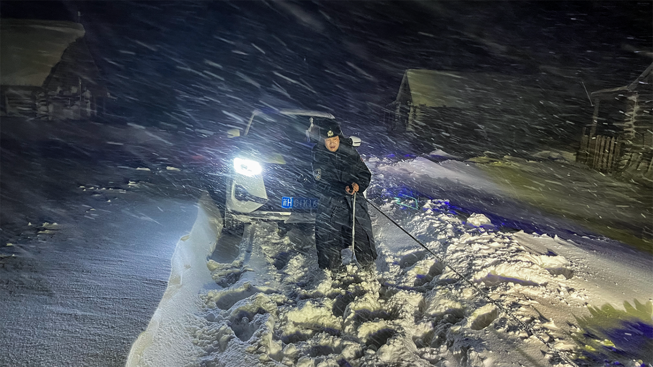 “我們決定徒步送物資進去,距離差不多就兩三公里的樣子!”劉愛龍下車后,一邊向單位匯報情況,一邊觀察前面的道路。積雪很厚,還伴有風吹雪,能見度較低。他們踩著過膝的積雪,一步一步向前,不到三公里的路程,他們來回走了近3個小時。