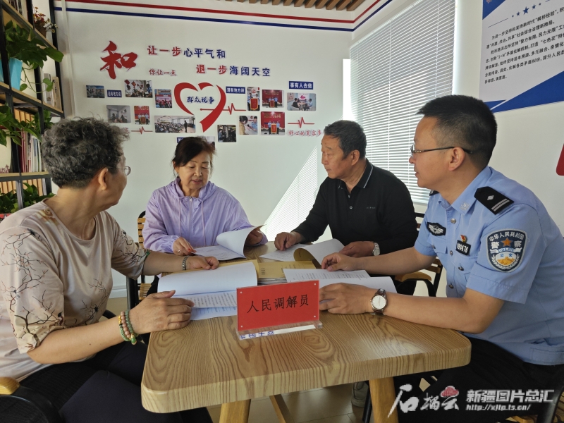 5月8日上午,克拉瑪依市公安局克拉瑪依區分局勝利路派出所教導員張海濤和調解員們復盤近期糾紛調解情況,總結經驗。石榴云/新疆日報記者 隋云雁 攝