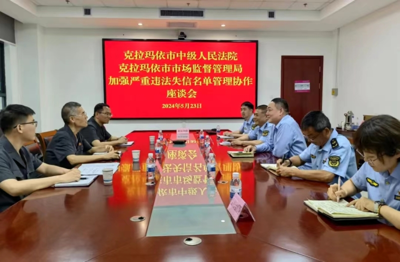 新疆平安網訊 5月23日,克拉瑪依市中級人民法院與克拉瑪依市市場監督管理局召開加強嚴重違法失信名單管理協作座談會。雙方就如何更好地暢通溝通協作機制、提高執法效率進行深入探討,就合力提高打擊“違法失信人員”的效率和效果,加強信息共享、健全完善溝通交流和跨部門協作機制達成一致意見。