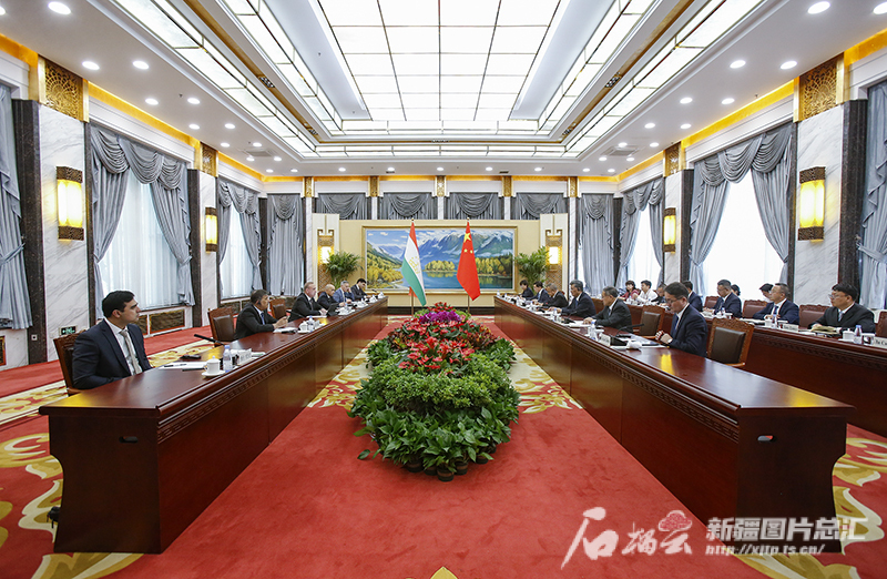 6月25日,自治區黨委書記馬興瑞、自治區主席艾爾肯·吐尼亞孜在烏魯木齊會見來新疆出席第八屆中國—亞歐博覽會的塔吉克斯坦第一副總理霍利克佐達一行。天山網-新疆日報記者 崔志堅攝