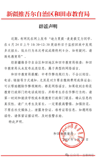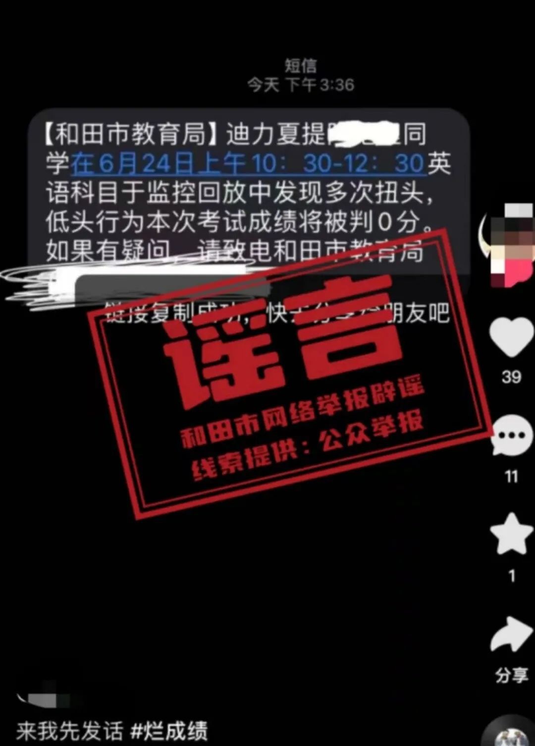 經(jīng)和田地區(qū)和田市教育局核查,該單位從未發(fā)布過類似信息,系網(wǎng)絡(luò)謠言。