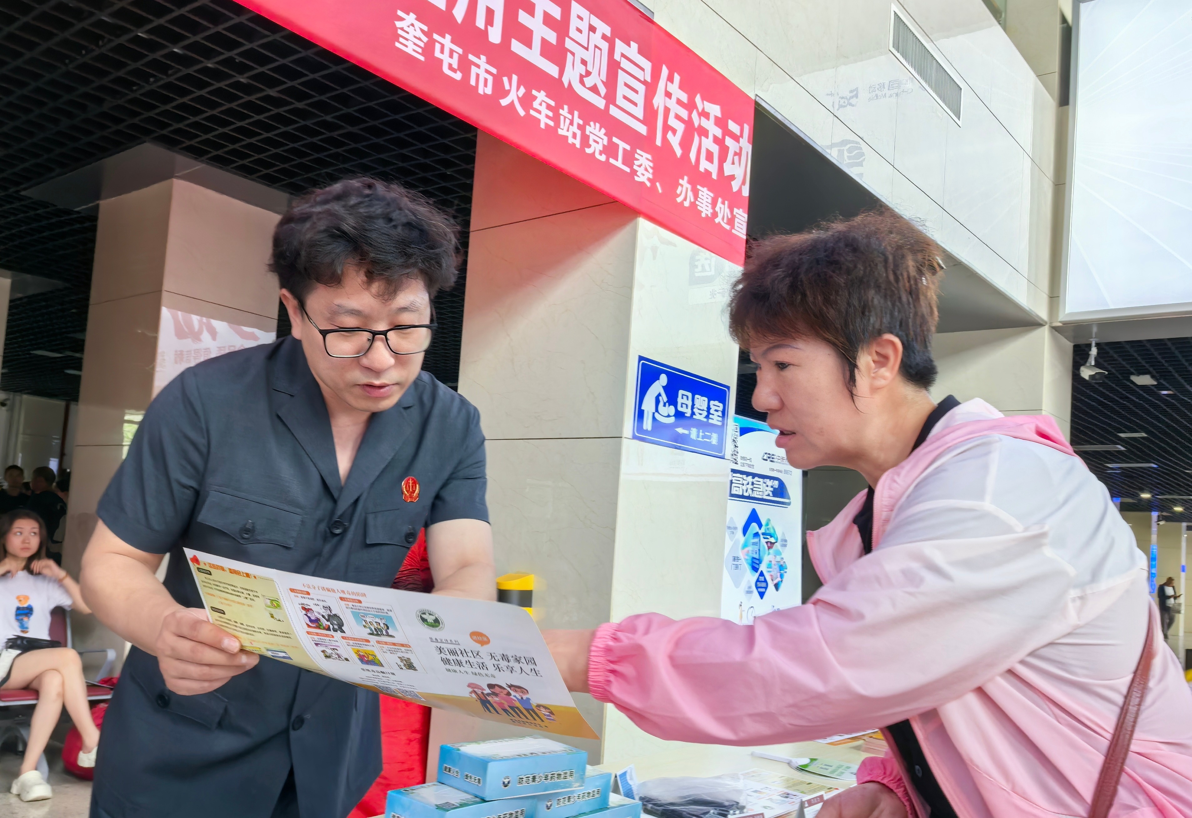 奎屯市人民法院聯合奎屯市火車站街道辦事處、奎屯市公安局車站派出所,在奎屯市火車站開展青少年禁毒宣傳教育活動,通過懸掛宣傳橫幅、擺放宣傳展板、發放宣傳手冊、解答法律咨詢等方式,向群眾詳細講解毒品種類、危害以及禁毒相關法律法規。