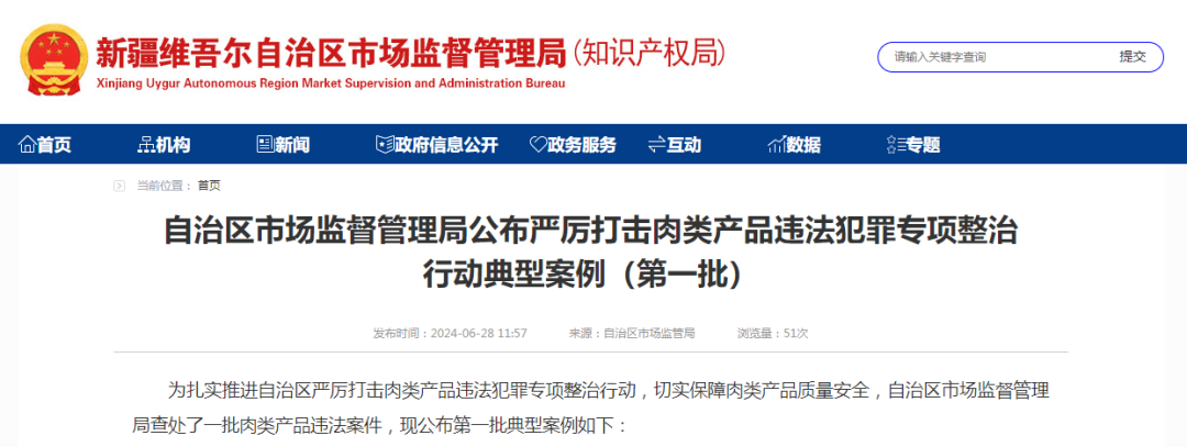 近日,自治區(qū)市場監(jiān)督管理局網(wǎng)站公布嚴厲打擊肉類產(chǎn)品違法犯罪專項整治行動典型案例(第一批)。