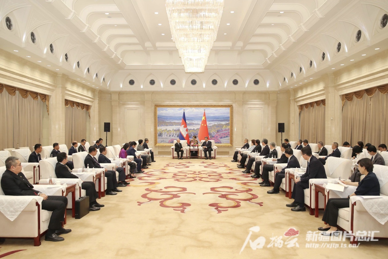 馬興瑞代表中共新疆維吾爾自治區委員會和自治區人民政府,歡迎西哈莫尼國王到訪,并介紹了新疆經濟社會發展情況。他說,中柬友好源遠流長,兩國老一輩領導人共同締造、精心培育的中柬傳統友誼歷久彌堅。在兩國元首共同引領下,中柬關系邁入構建高質量、高水平、高標準命運共同體的新時代。習近平主席和中共中央高度重視新疆工作,引領新疆各項事業發展取得歷史性成就,各族群眾獲得感、幸福感、安全感大幅提高。當前我們正全面學習貫徹中共二十屆三中全會精神,完整準確全面貫徹新時代中國共產黨的治疆方略,錨定在國家全局中的戰略定位,持續深化與共建“一帶一路”國家全方位交流合作,不斷以高水平對外開放促進高質量發展。近年來,中國新疆與柬埔寨地方間交流合作穩步發展,雙方貿易增長強勁。我們將認真落實兩國領導人重要共識,進一步密切雙方各層級交往,深化產業、貿易、投資等領域合作,以“中柬人文交流年”為契機促進文化、旅游交流互鑒,不斷提升友好交往和互利合作水平,為構建新時代中柬命運共同體作出新貢獻。