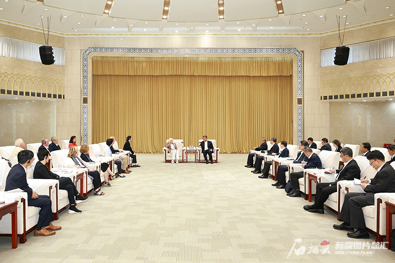 9月9日,自治區黨委書記馬興瑞、自治區主席艾爾肯·吐尼亞孜在烏魯木齊會見來新疆實地考察的英國、法國、德國、意大利、西班牙、瑞士、奧地利等歐洲國家的旅行商代表。天山網-新疆日報記者 崔志堅攝