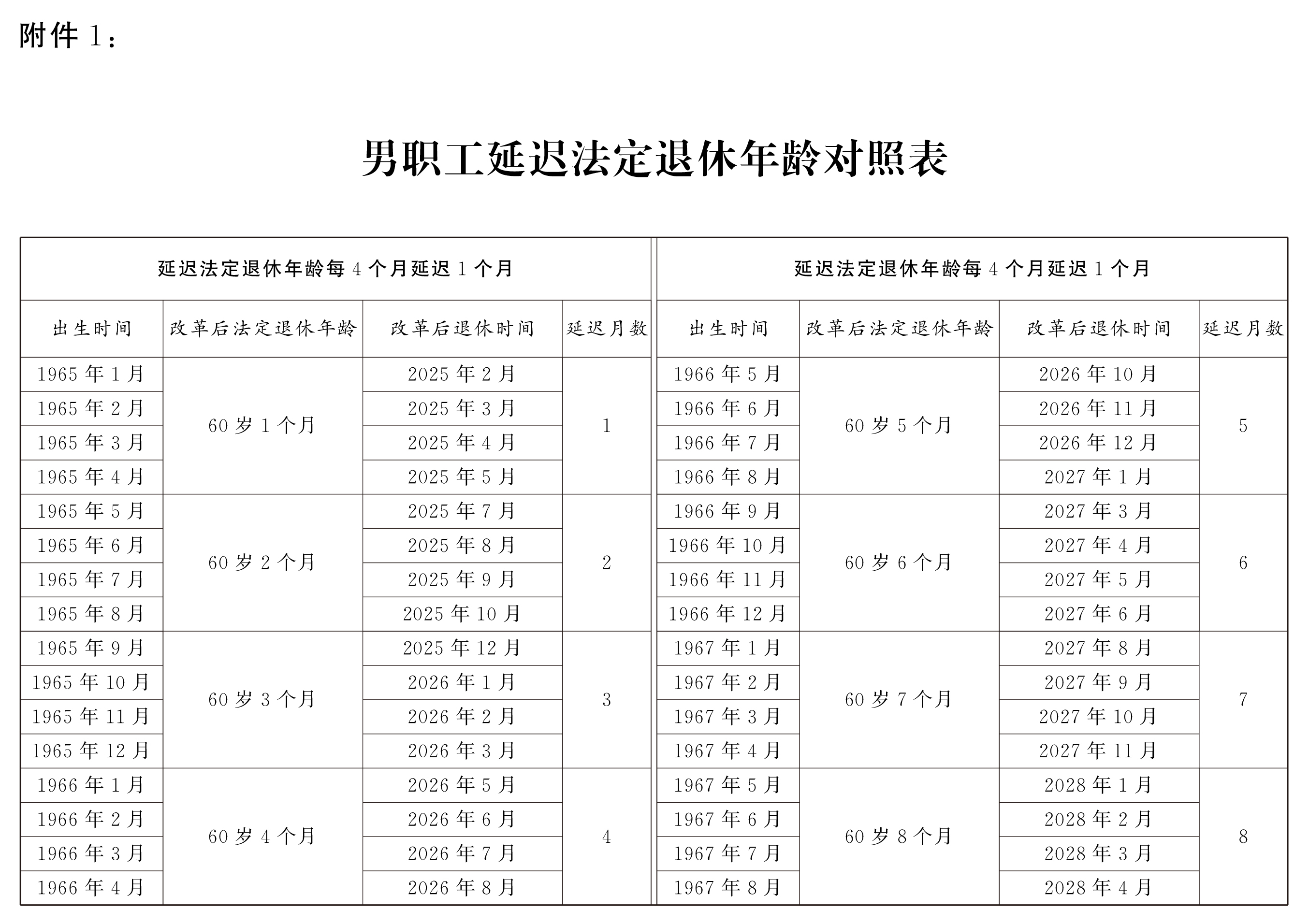 第一條?從2025年1月1日起,男職工和原法定退休年齡為五十五周歲的女職工,法定退休年齡每四個月延遲一個月,分別逐步延遲至六十三周歲和五十八周歲;原法定退休年齡為五十周歲的女職工,法定退休年齡每二個月延遲一個月,逐步延遲至五十五周歲。國家另有規(guī)定的,從其規(guī)定。