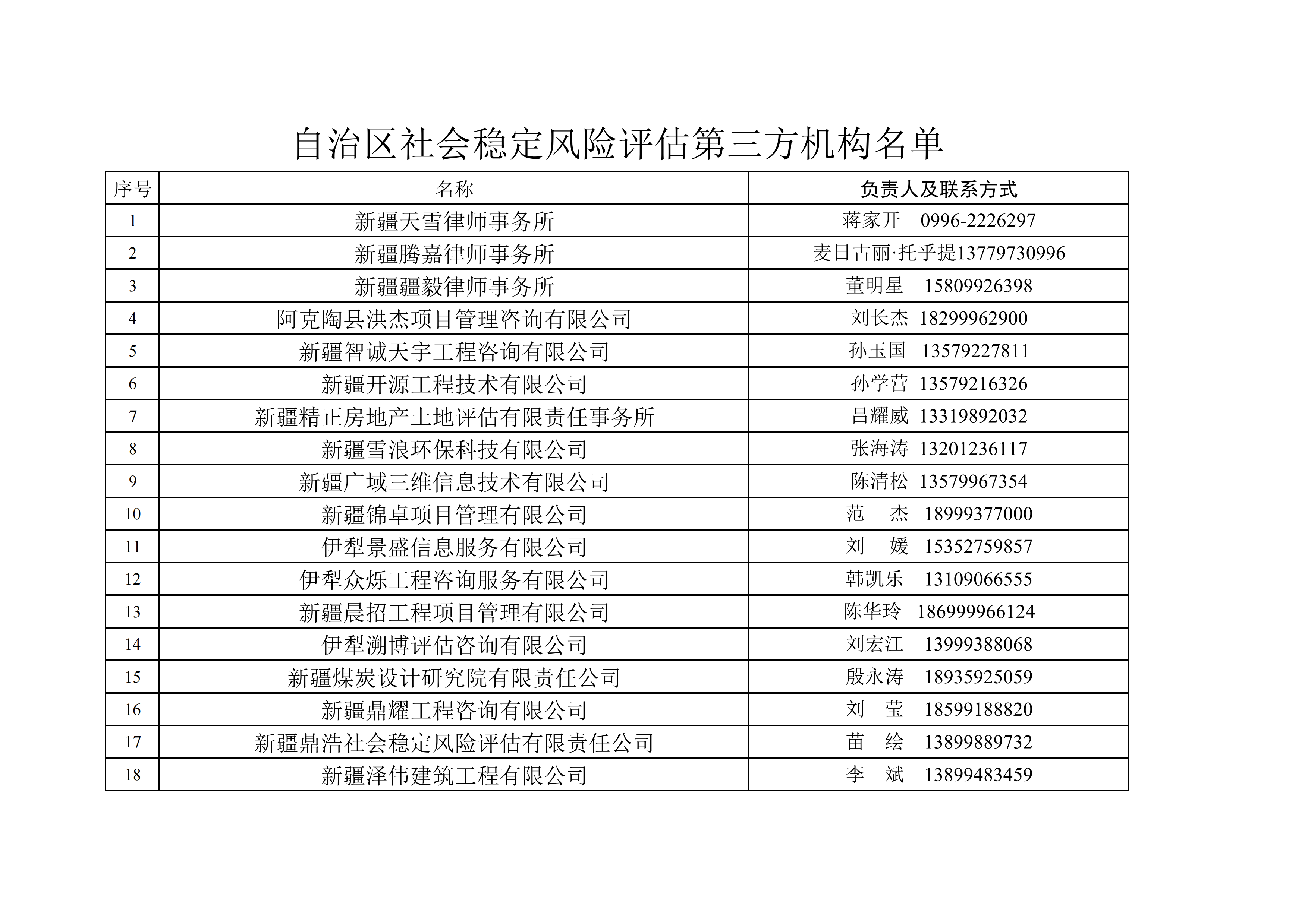 為進一步推動全區(qū)重大決策社會穩(wěn)定風險評估工作規(guī)范化、專業(yè)化建設,經各地州市按有關程序篩選推薦,建立自治區(qū)級重大決策社會穩(wěn)定風險評估第三方機構庫,現予以公告,供評估或實施主體選取使用。今后,自治區(qū)將依據有關規(guī)定,按程序做好此庫的動態(tài)管理,及時更新入庫第三方機構名單。