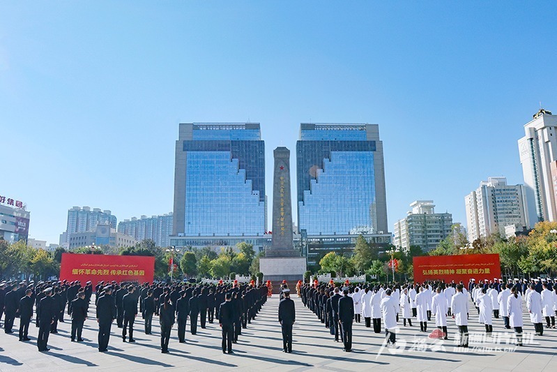 豐碑永存,激揚浩然正氣。精神不朽,激勵前行腳步。烏魯木齊人民廣場上,中國人民解放軍進軍新疆紀念碑巍然聳立。紀念碑正前方,排列著以自治區黨委,自治區人大常委會,自治區人民政府,自治區政協,新疆軍區,新疆生產建設兵團,各民主黨派、自治區工商聯和無黨派人士,烏魯木齊市各族各界群眾,少先隊員名義敬獻的9個花籃。各族各界代表整齊列隊。