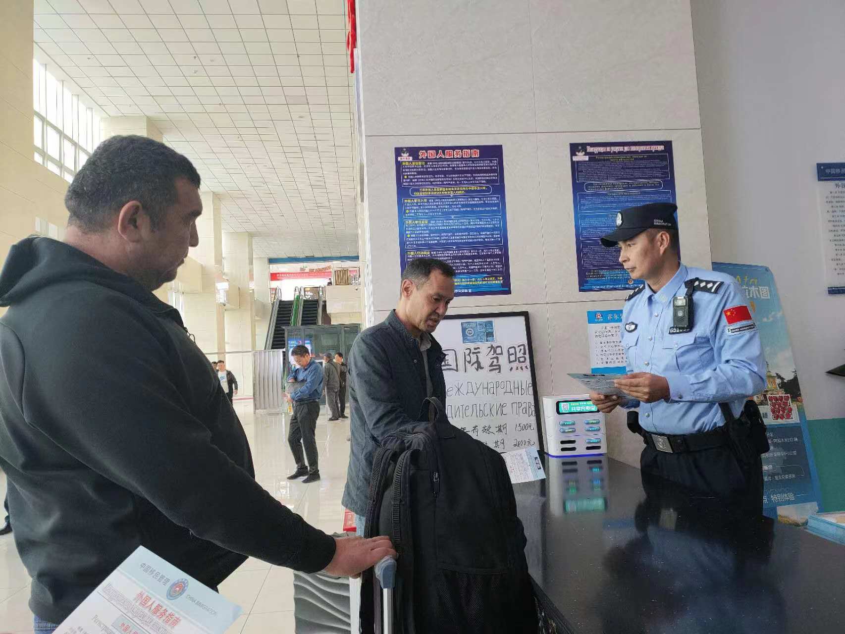 在霍爾果斯國際客運站里,由霍爾果斯市公安局出入境管理大隊和伊犁邊境管理支隊霍爾果斯邊境管理大隊霍爾果斯邊境派出所國門警務室共同建立的“外國人管理服務站”往來人流不斷,對中外游客提供出入境業務咨詢、法律法規宣傳等服務。