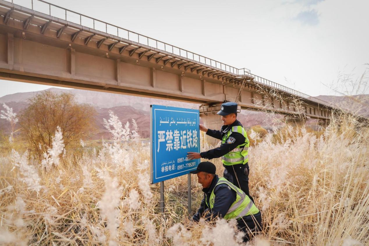 在景區開展鐵路安全普法宣傳告一段落,周博又馬不停蹄地領著新警瓦熱斯·阿布都吉力力向庫俄鐵路線方向前行巡查。