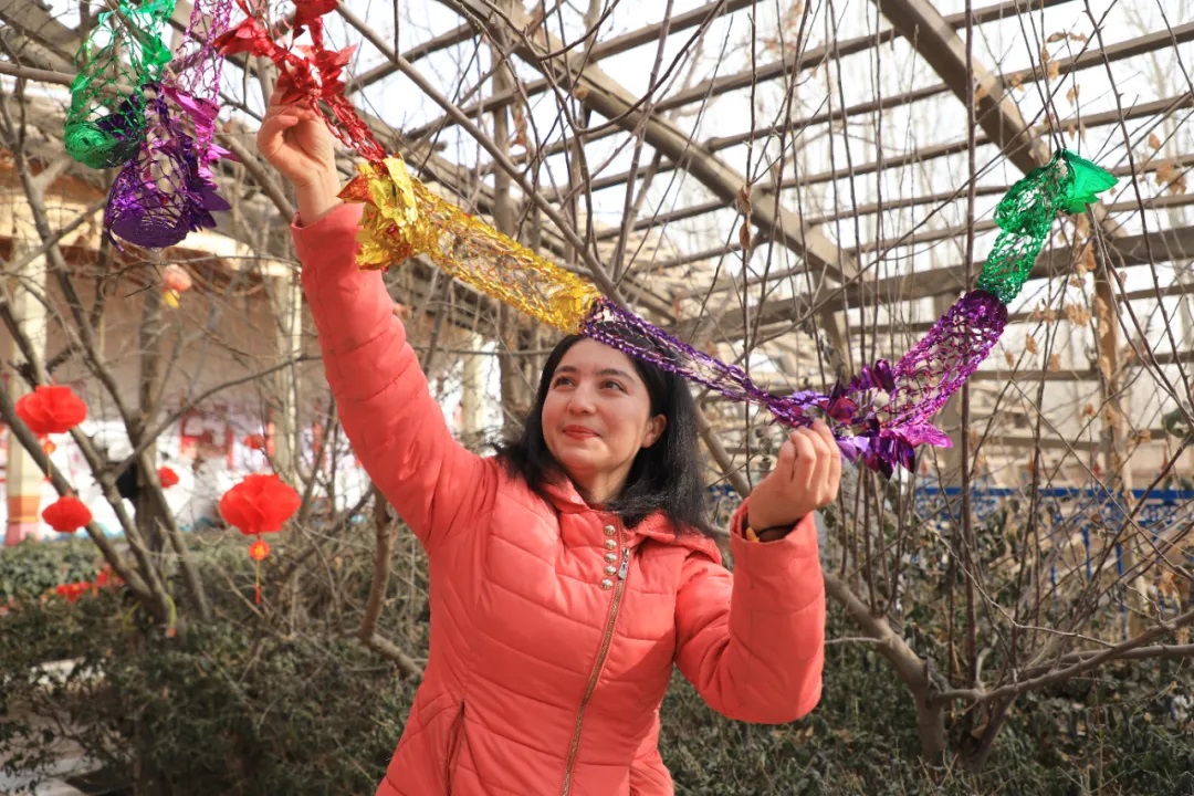 村里鑼鼓喧天,村民家里也不遑多讓。站敏鄉(xiāng)艾日克貝西村農(nóng)民布艾杰爾·吾守爾正和家人將精心挑選的“福”字、紅燈籠、拉花,掛到自家門頭。“馬上到春節(jié)了,我們買了一些紅燈籠,將對(duì)聯(lián)貼到家門口,高高興興地過年,這樣特別有年味。”她說。